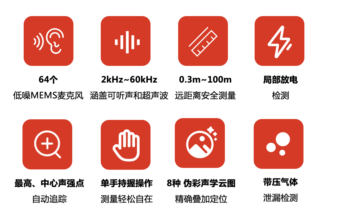 ??滴⒂癆P56系列聲波成像儀是一款專業(yè)的聲源定位產(chǎn)品。憑借64個低噪聲MEMS麥克風(fēng)和從2 kHz到60 kHz的可調(diào)帶寬范圍,AP56提供了一種簡單有效的方法來定位工業(yè)環(huán)境中的加壓空氣泄漏或檢測高壓系統(tǒng)中的局部放電。采用4.3英寸大液晶觸摸屏,數(shù)字圖片上顯示的結(jié)果,讓您快速找到問題的根源。操作距離可達(dá)100 m,確保您在距離內(nèi)進(jìn)行檢查。采用這種輕巧易用的工具,您可以發(fā)現(xiàn)潛在的風(fēng)險,減少故障排除,并節(jié)省設(shè)備故障和停機時間的額外成本。