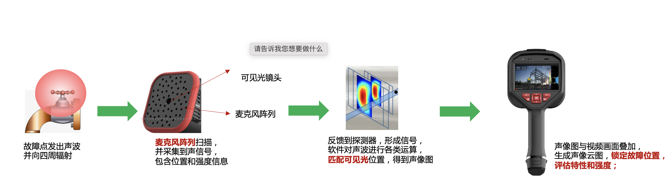聲學(xué)成像原理 聲像儀——又名聲學(xué)相機,是利用聲傳感器陣列測量一定范圍內(nèi)的聲場分布的專用設(shè)備。可用于測量物體發(fā)出的聲音的位置和聲音輻射的狀態(tài),將采集的聲音以彩色等高線圖譜的方式可視化呈現(xiàn)在屏幕上,有效的測量聲場分布,聲場圖與可見光的視頻圖像**疊加,形成類似于衛(wèi)星云圖的圖像,對故障位置,故障特性,強度進(jìn)行顯示。 ![]()